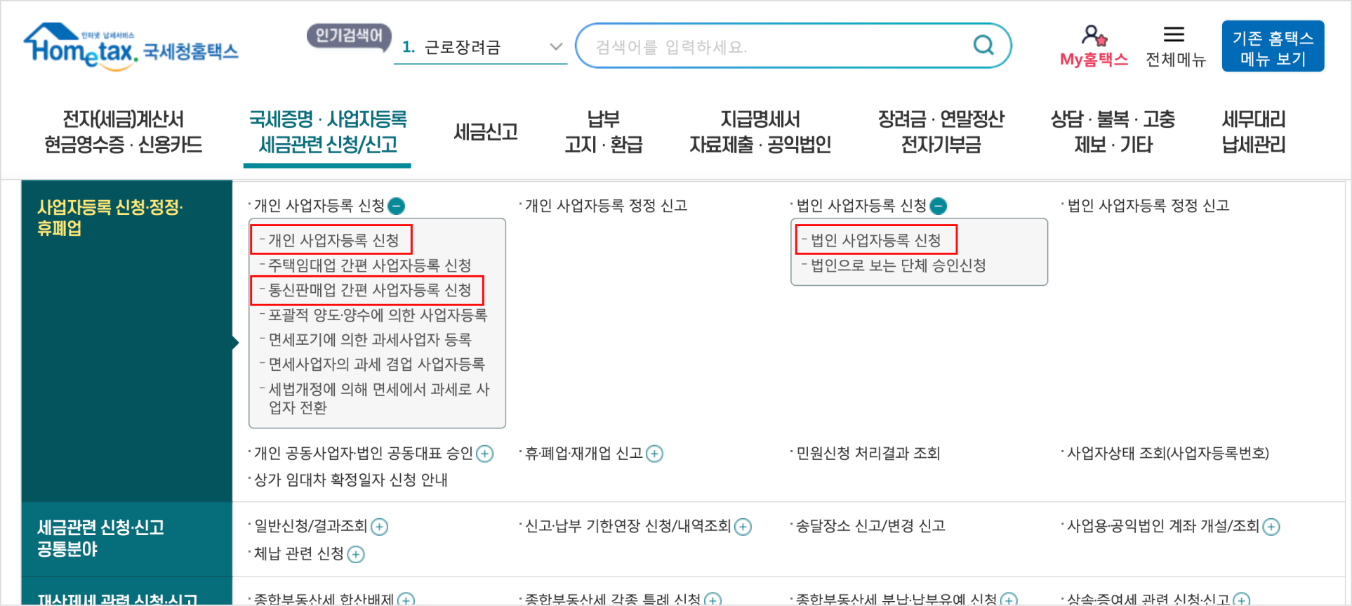 1. 국세증명.사업자등록 세금관련 신청 신고 탭을 선택합니다.