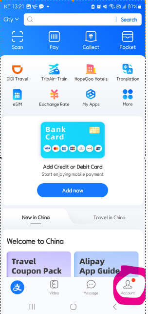 • 앱 실행: 알리페이 앱을 실행합니다.
