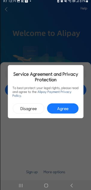 - 알리페이 이용 약관 동의: 알리페이 이용 약관을 확인하고 동의합니다.