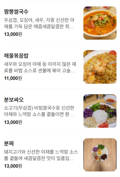 - 주요 메뉴: 쌀국수, 분짜, 볶음밥, 짜조, 카페쓰어다(연유커피)등 베트남 음식