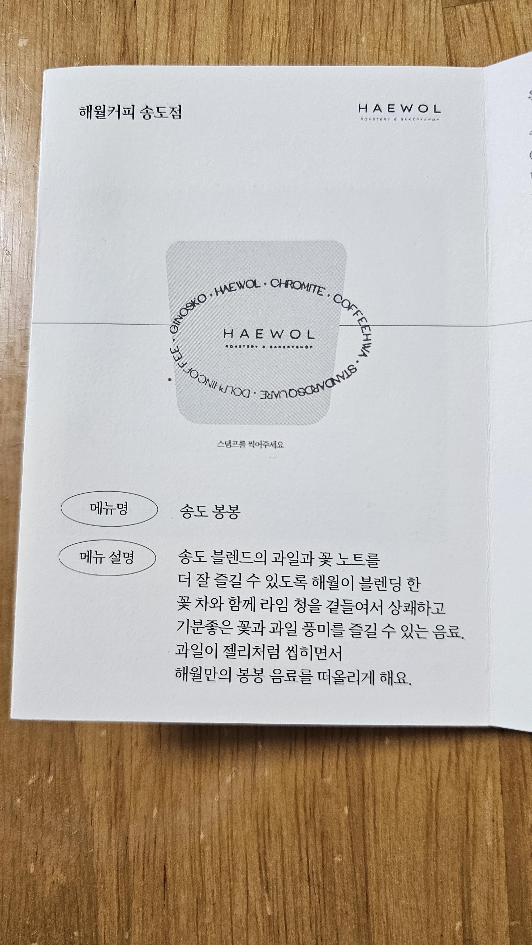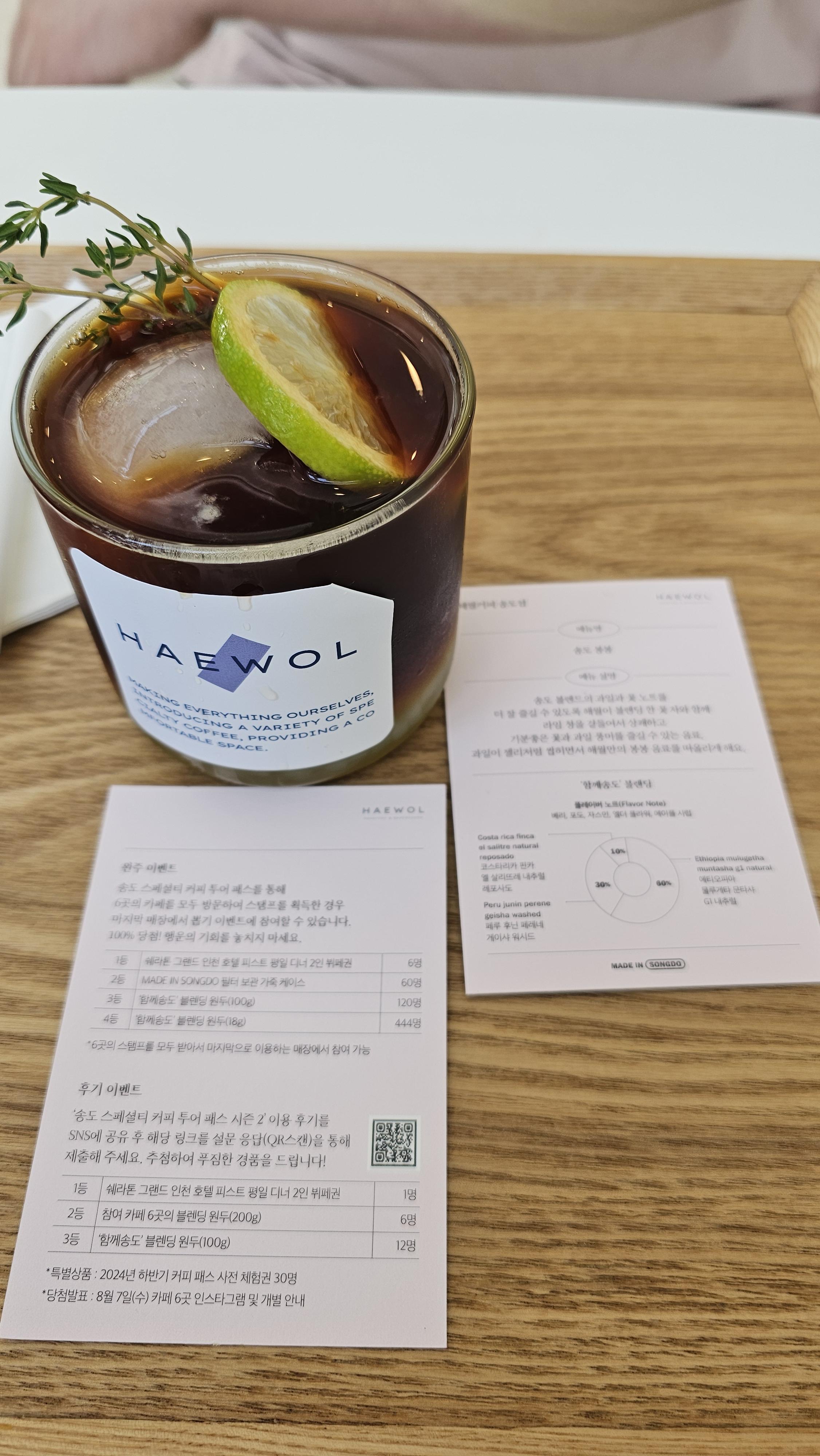 메뉴설명 : 송도 블렌드의 과일과 꽃 노트를 더 잘 즐길 수 있도록 해월이 블렌딩한 꽃 차와 함께 라임 청을 곁들여