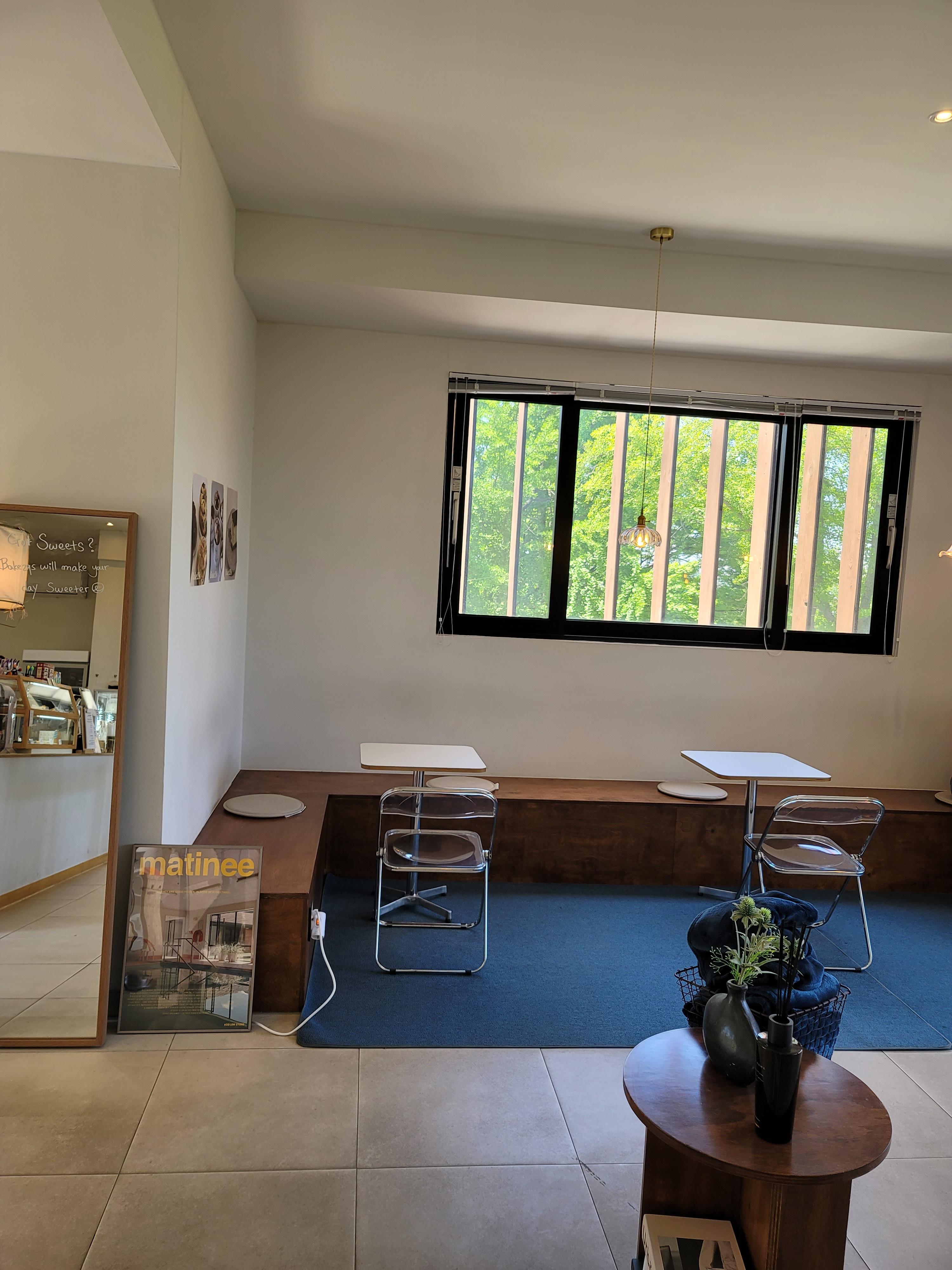 이 공간은 베이크카페를 나오면 밖에 있는 통유리창으로 커피를 들고와서 먹게 되는 공간이에요.
