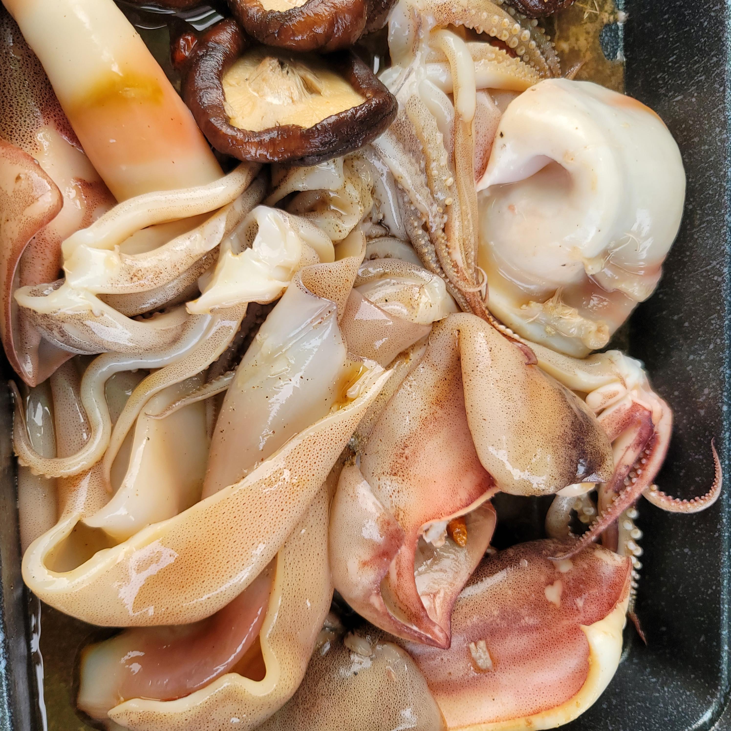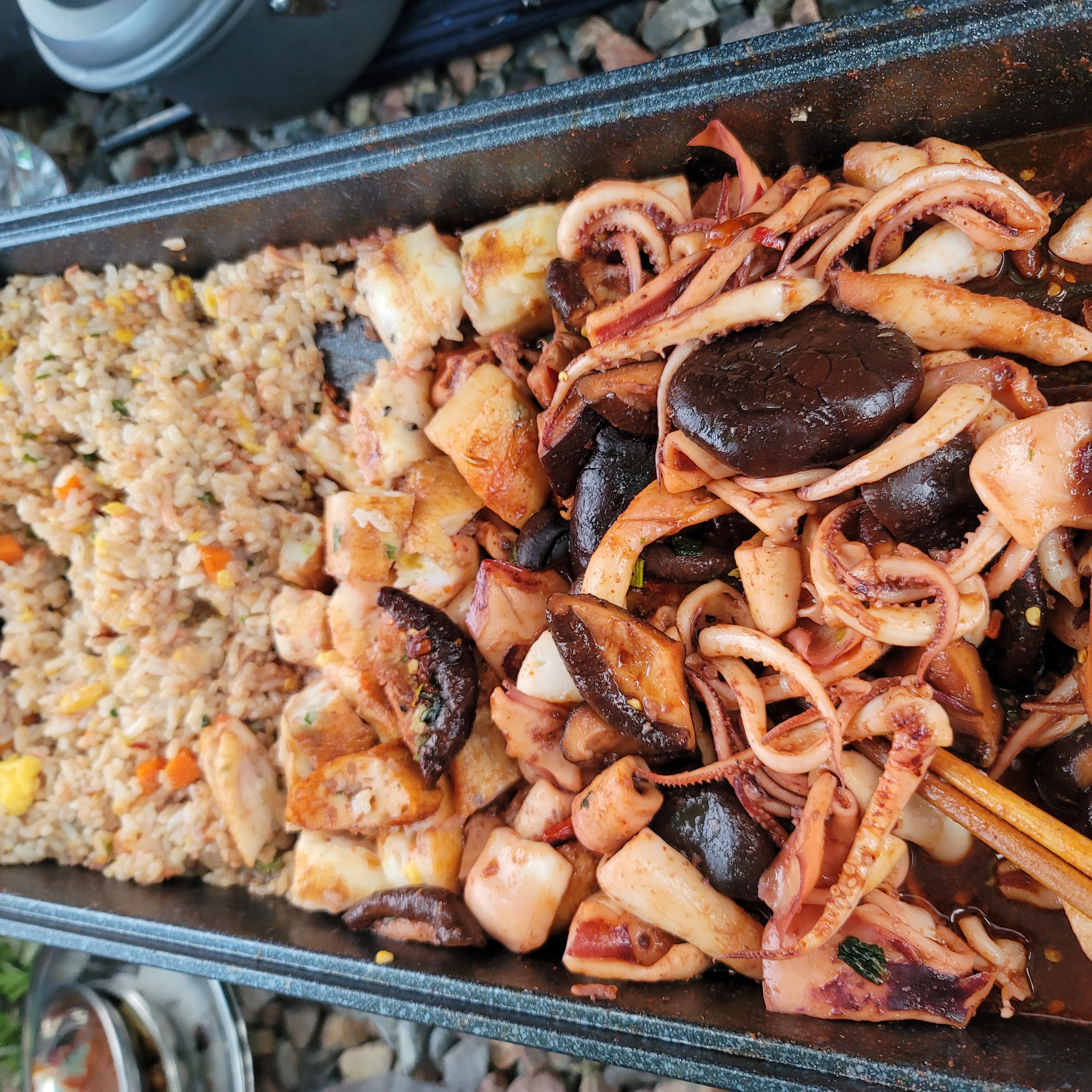 먼저 가장 빨리 상할것같은 해산물을 호다닥 볶고, 그옆에 볶음밥, 그리고 고기에 꼬치까지 야무지게 챙겨 먹어줘요