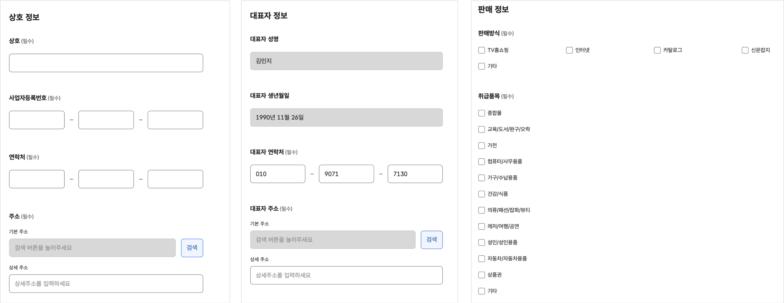 상호 정보, 대표자 정보, 판매 정보 입력 및 선택
