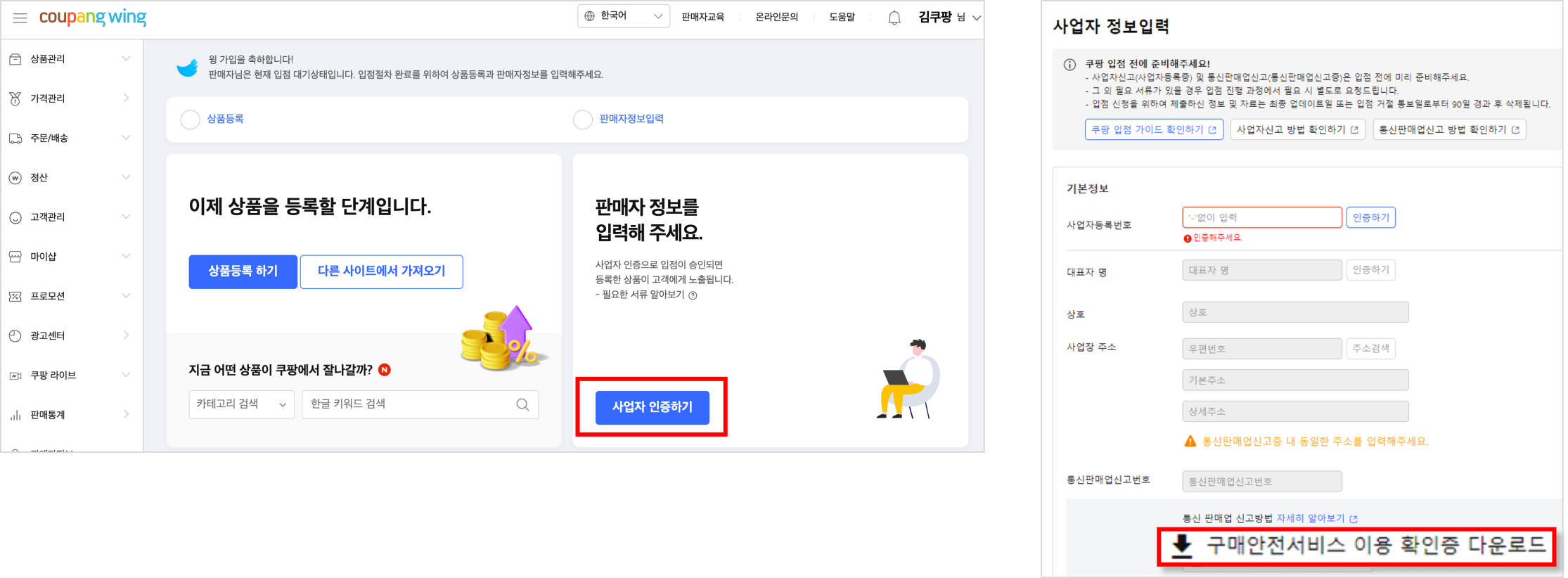 구비서류 란에 쿠팡윙에서 다운 받은 구매안전서비스 이용 확인증 업로드