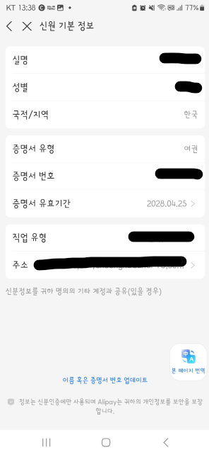 주의사항: 알리페이는 실명 인증이 필수이며, 여권, 신분증 등 개인 정보를 정확하게 입력해야 합니다.