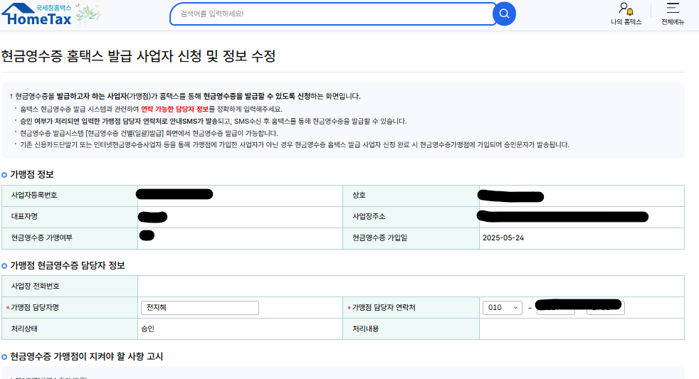 - 현금영수증 가맹점 가입 신청서를 작성합니다.