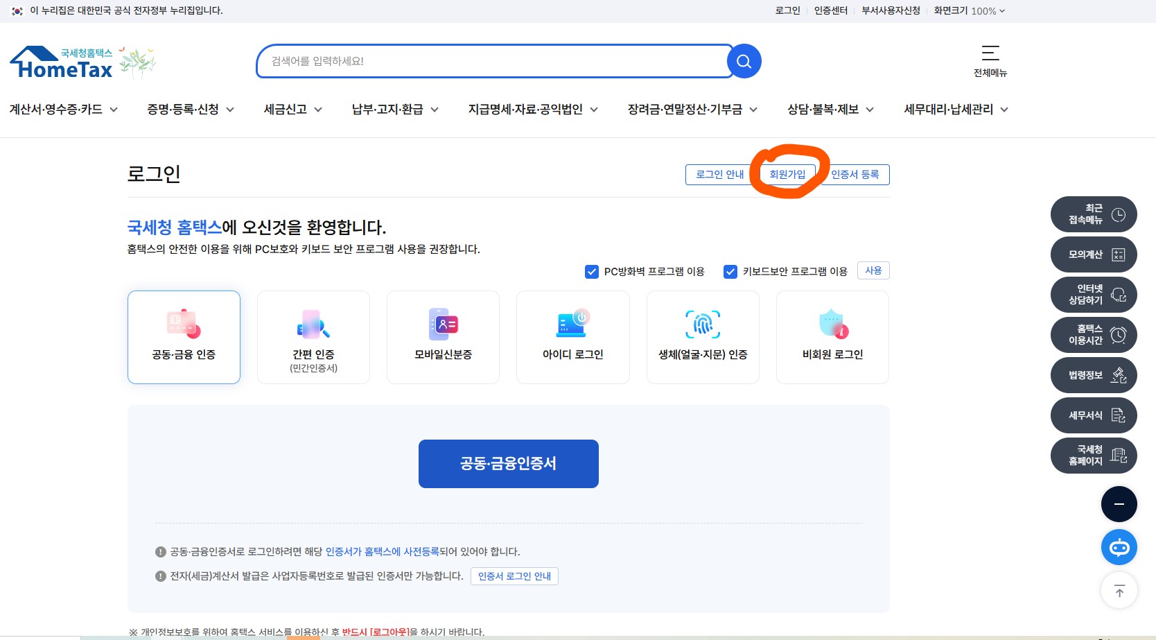 - 홈택스 메인 페이지에서 "회원가입" 버튼을 클릭합니다.