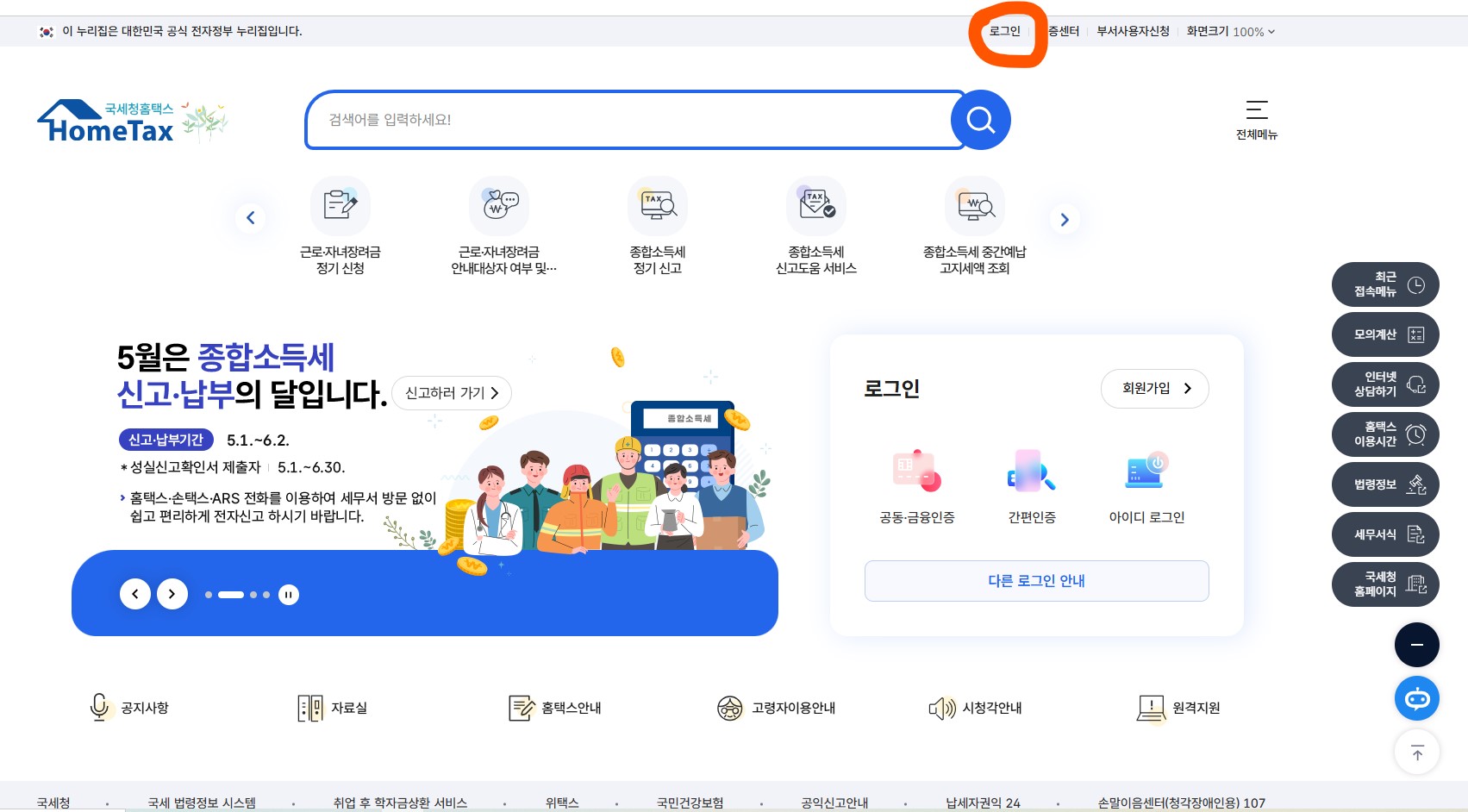 - 홈택스에 로그인하여 세금 신고, 납부, 증명서 발급 등 다양한 서비스를 이용할 수 있습니다.