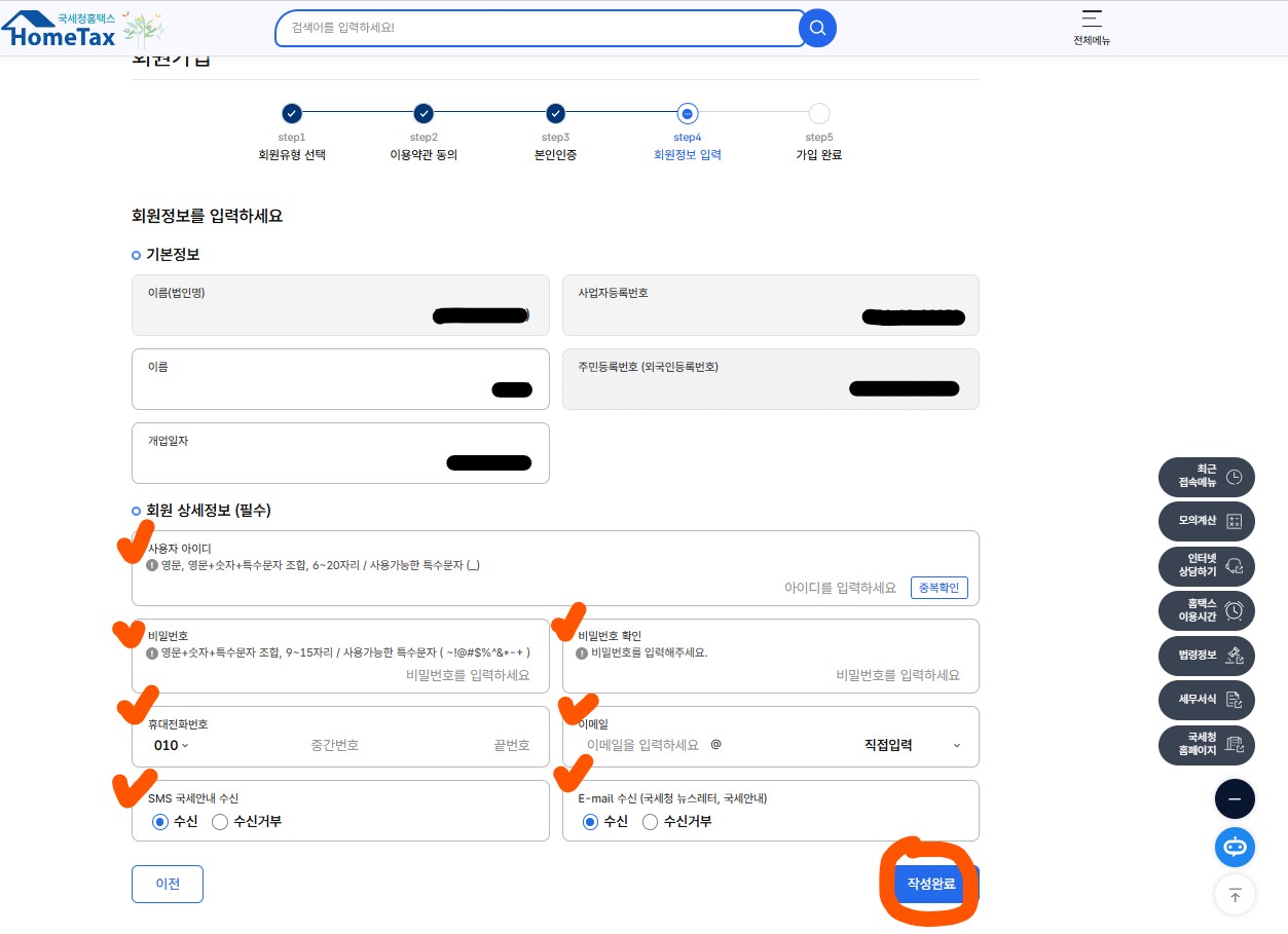 - 모든 정보를 입력하고 "회원가입" 버튼을 클릭하면 홈택스 사업자 회원 가입이 완료됩니다.