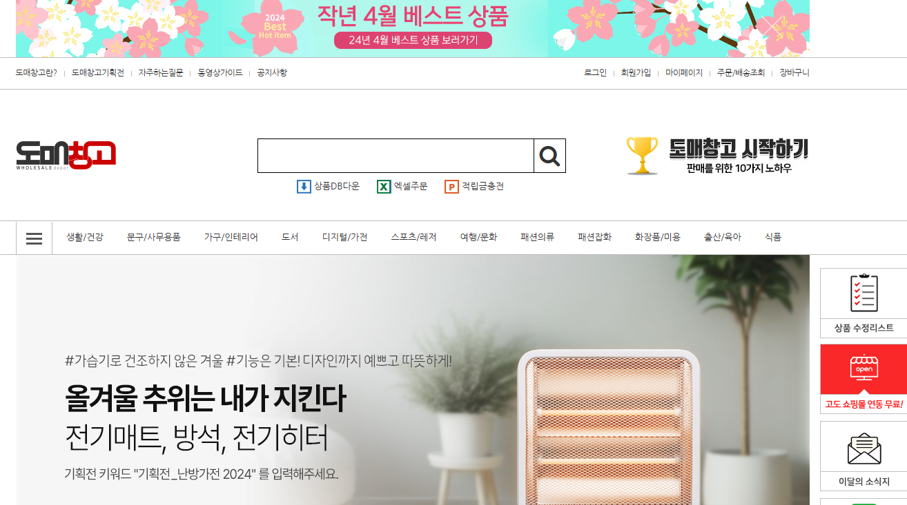 - 도매창고: 공산품, 생활용품, 주방용품 등 다양한 상품을 취급하는 도매사이트입니다. 대량 구매 시 할인 혜택을 제공하며, 자체 물류 시스템을 통해 빠른 배송을 지원합니다.